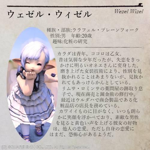 ↑NEW OLD↓ 足跡は、続く6者6様人生模様、1冊で由狩宅RP自機が分かる本。OFF ヴァルラム・リエラシュ ウェゼル・ウィゼル エルガナ・カッリ テルミツ・ウルシマ ポエナ・パトリオータ ラウ・ラシュレー ロールプレイ 文章 BL HLラウ・ラシュレーという女10人のリテイナーが語る、ラウ・ラシュレーという女について。聞き手はそれぞれ自機達である。ヴァルラム・リエラシュ ウェゼル・ウィゼル エルガナ・カッリ テルミツ・ウルシマ ラウ・ラシュレー ロールプレイ 文章 濃い、恋、来い!今や元気なオネエさんとなったウェゼル、本日のガールズトーク。ちょっぴりエーテル学者の先生のお話も。ヴァルラム・リエラシュ ウェゼル・ウィゼル ロールプレイ 文章 BL HL ロスガル×ミコッテ 男の娘漣のかけら女の子になりたかった男の子の、苦い初恋の話。ウェゼル・ウィゼル ロールプレイ 文章 BL 失恋 男の娘